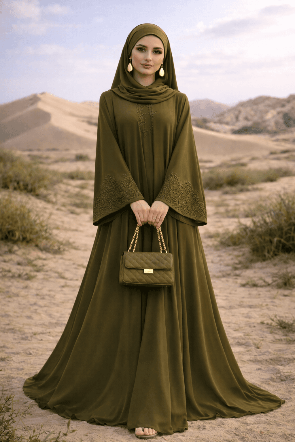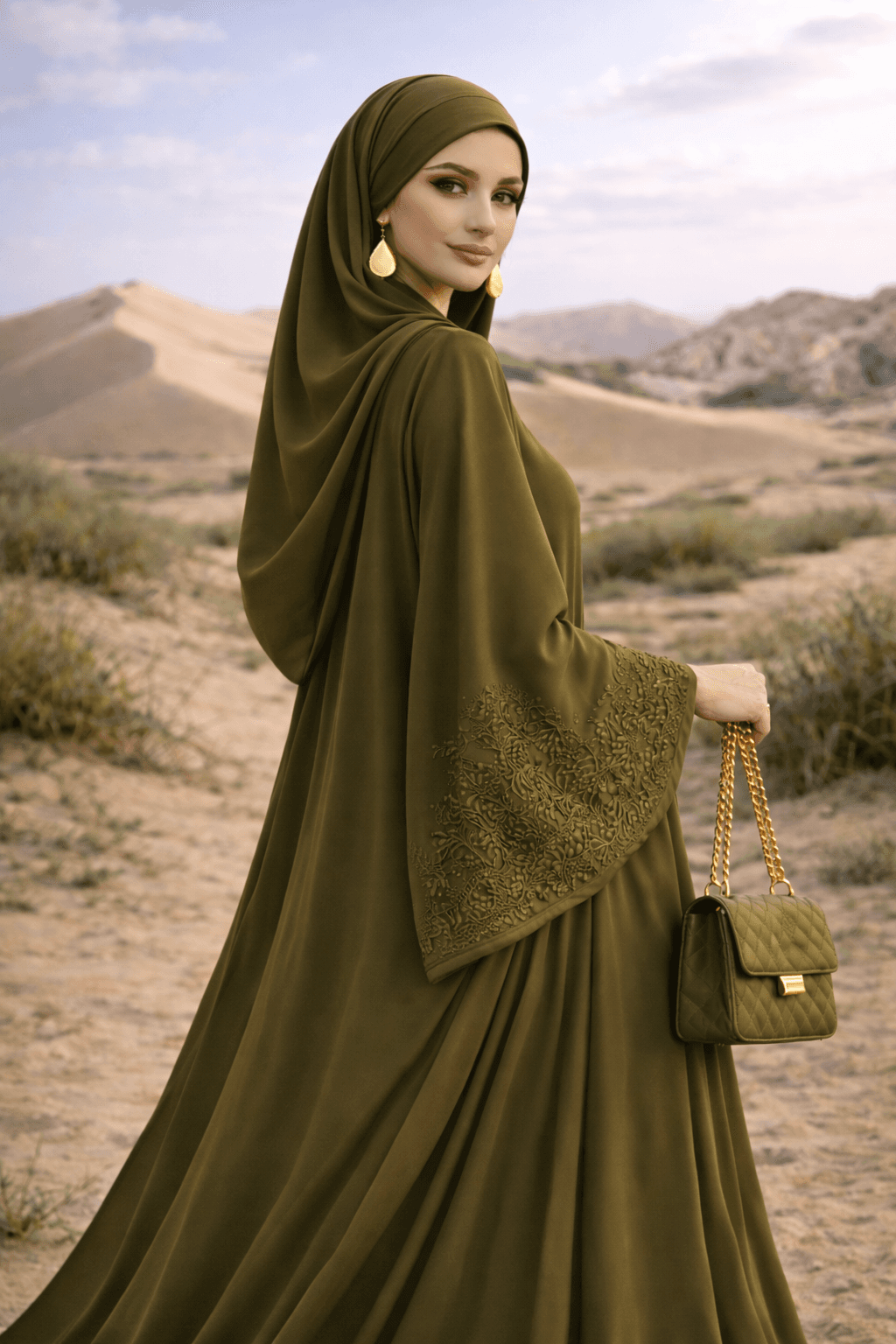 Abaya in paisley fringe jacquard with Cropped overlap. Matching belt in tonal jacquard.